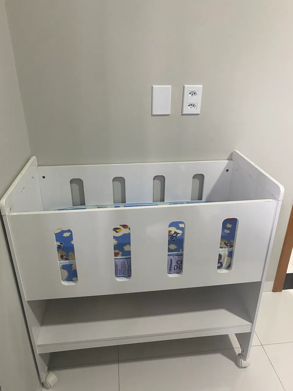 Lindo mini berço branco + colchão, ideal para o quarto do seu bebê! Design moderno e seguro, perfeito para proporcionar noites de sono tranquilas. Leve e fácil de transportar.