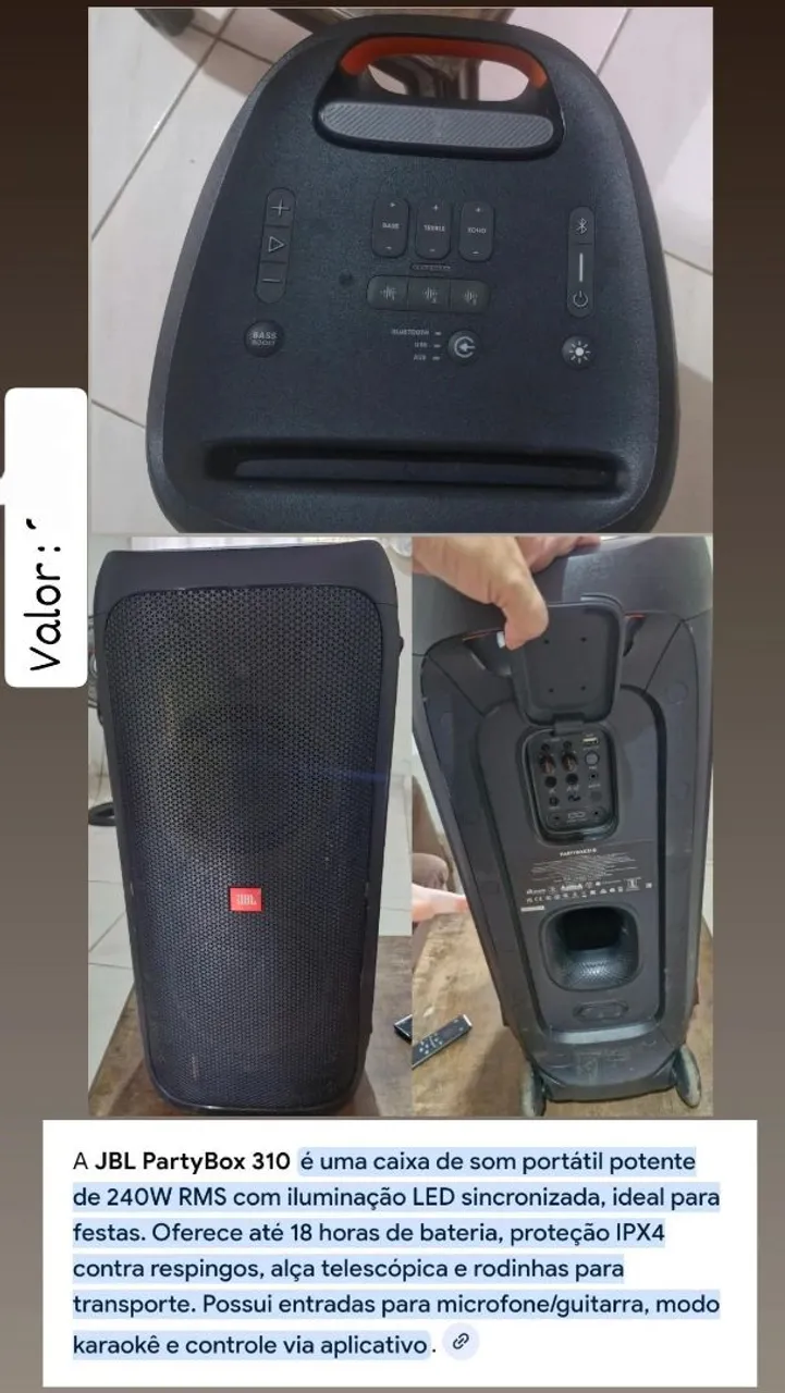 A JBL PartyBox 310 é a caixa de som perfeita para animar suas festas! Com 240W RMS, iluminação LED sincronizada, bateria de 18 horas e proteção IPX4, ela é potente e resistente. Possui entradas para microfone/guitarra e controle via aplicativo.