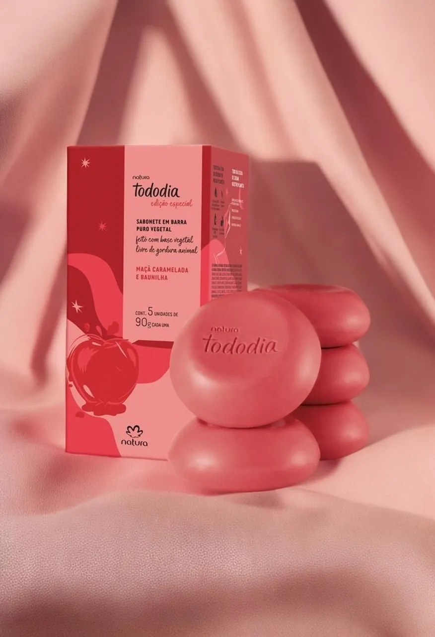 Desfrute da deliciosa fragrância de maçã caramelada e baunilha com o sabonete em barra Tododia da Natura. Feito com base vegetal, proporciona limpeza suave e perfumação duradoura.