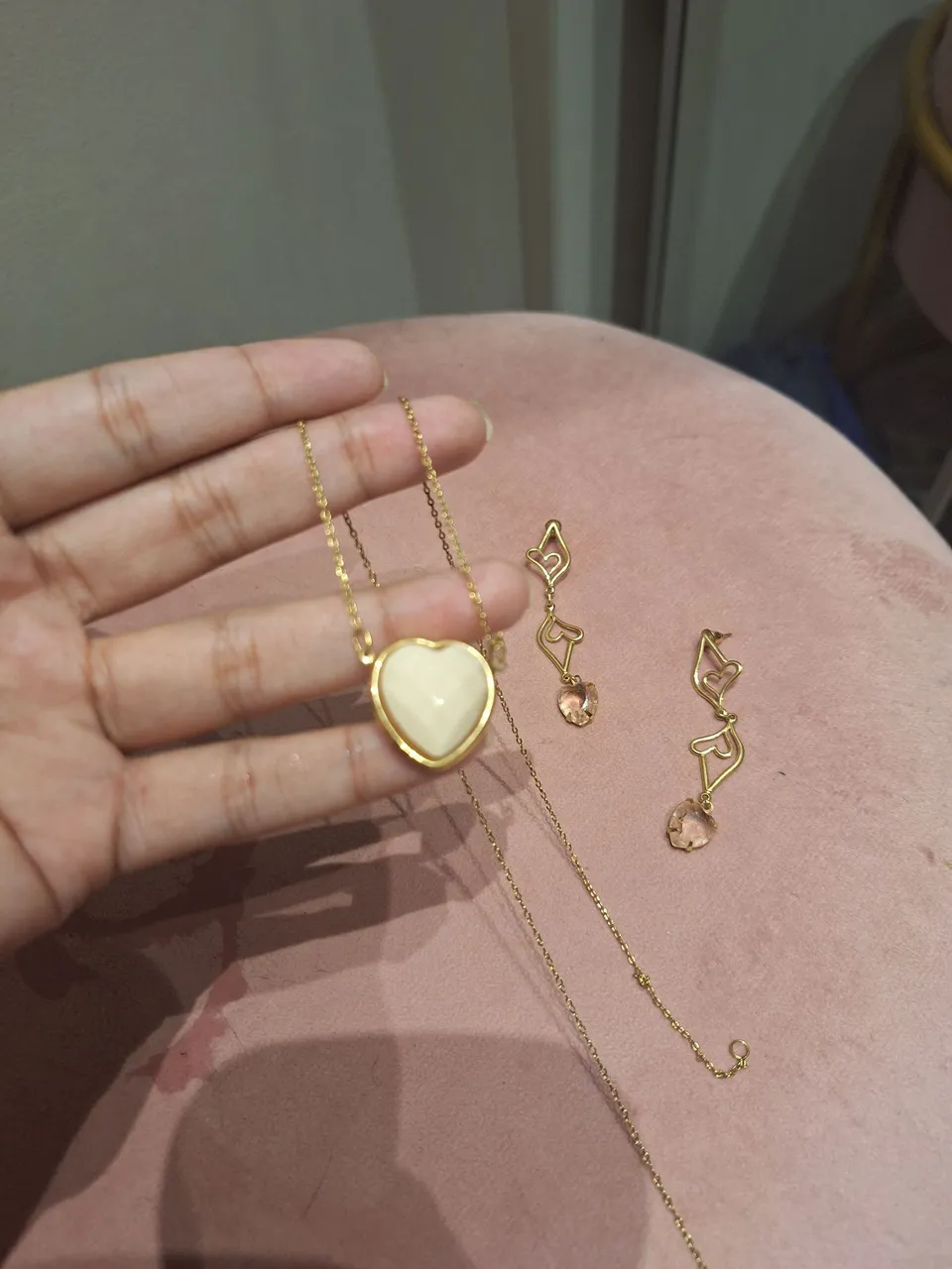 Lindo colar de coração em ouro, perfeito para presentear ou para usar em ocasiões especiais. O colar possui um pingente de coração com um detalhe em bege, e os brincos são delicados e charmosos. Essa joia custa em torno de 400 reais na loja e você pode estar adquirindo aqui por apenas 200 reais. Com comprovante de que foi comprado na romannel