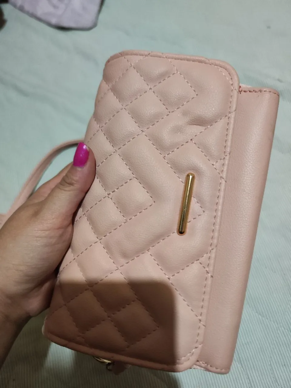 Linda bolsa rosa com design matelassê, perfeita para diversas ocasiões. Possui detalhes em dourado e um tamanho ideal para carregar seus pertences como celular carteira etc
