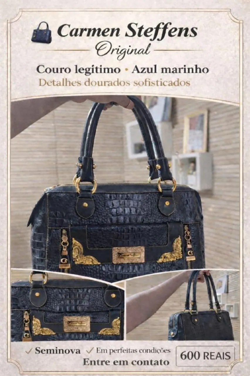 Linda bolsa Carmen Steffens original em couro legítimo, detalhes dourados sofisticados e cor azul marinho. Perfeita para complementar seu look com elegância e estilo!
