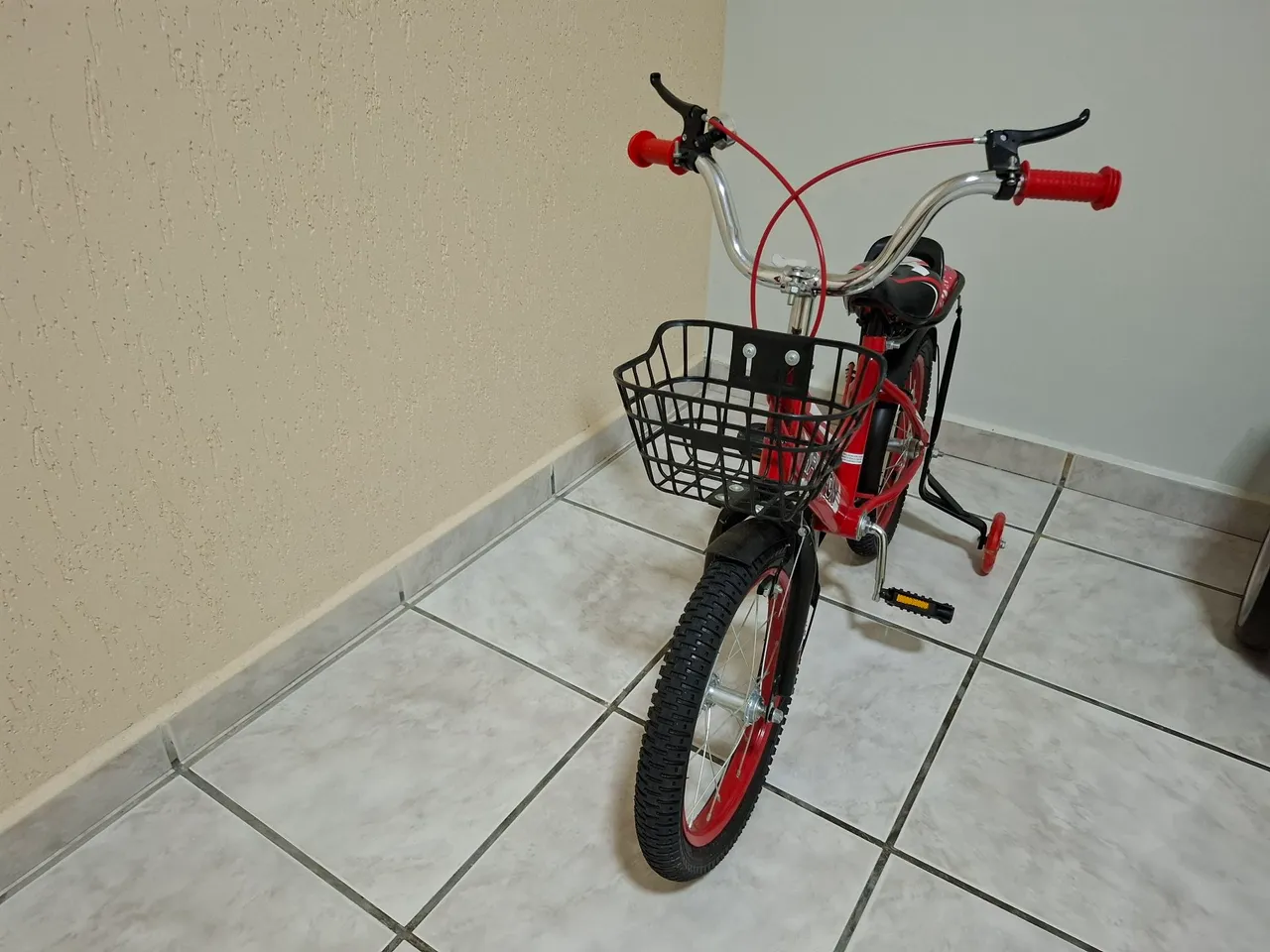 Linda bicicleta infantil vermelha, perfeita para as primeiras aventuras dos pequenos ciclistas! Com design moderno e cesta, garante diversão e segurança para as crianças.