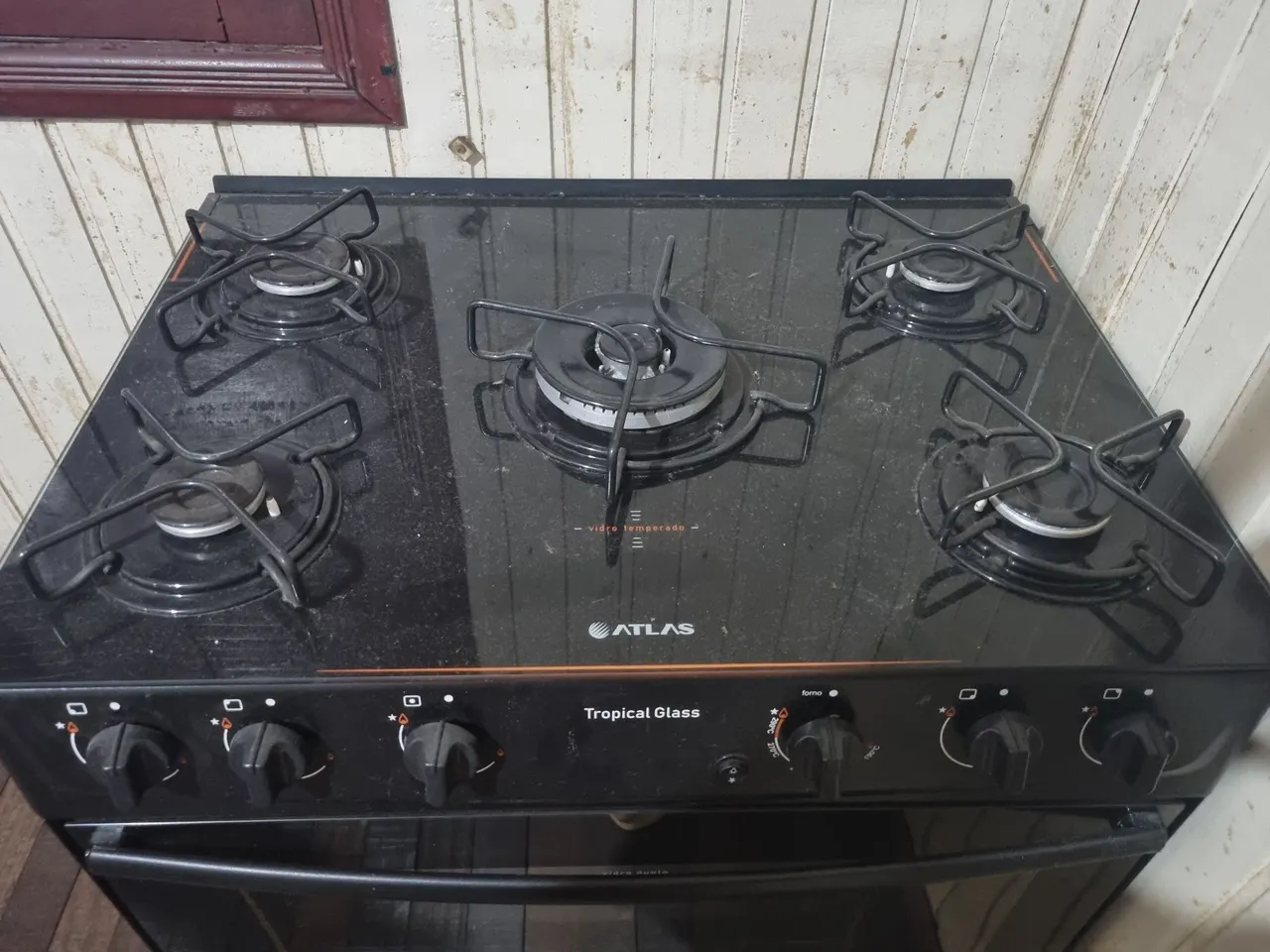 Fogão Atlas Tropical Glass com 5 bocas, design moderno e mesa de vidro temperado que facilita a limpeza. Ideal para quem busca eficiência e beleza na cozinha.