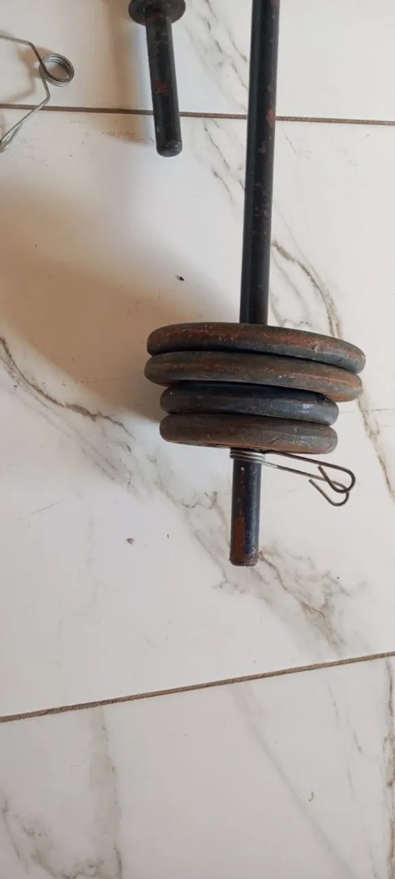Halteres e barra de musculação ideais para seus treinos. Perfeito para quem busca força e resistência. 1 halteres 5 kg 1 halteres 10 kg 20 kg em anilhas 1 barra de 1.5 metros 2 barras de halteres