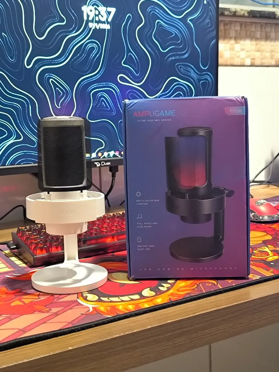 Microfone Fifine Ampligame A8 RGB para gamers, com iluminação vibrante e design moderno. Capture sua voz com clareza e sem ruído, ideal para streaming e jogos. Fácil de usar e configurar, este microfone eleva sua experiência!
