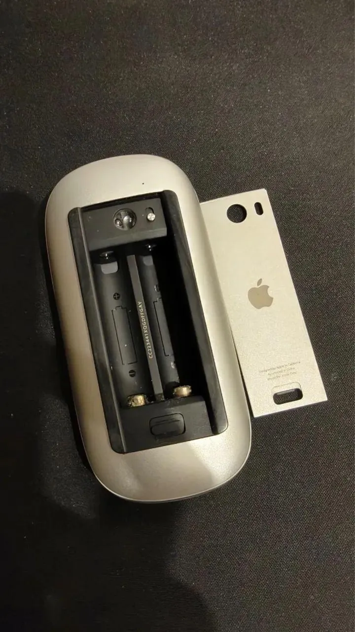 O Magic Mouse branco a pilha é o modelo de primeira geração (A1296), que utiliza duas pilhas AA e funciona via Bluetooth. Por $250reais
