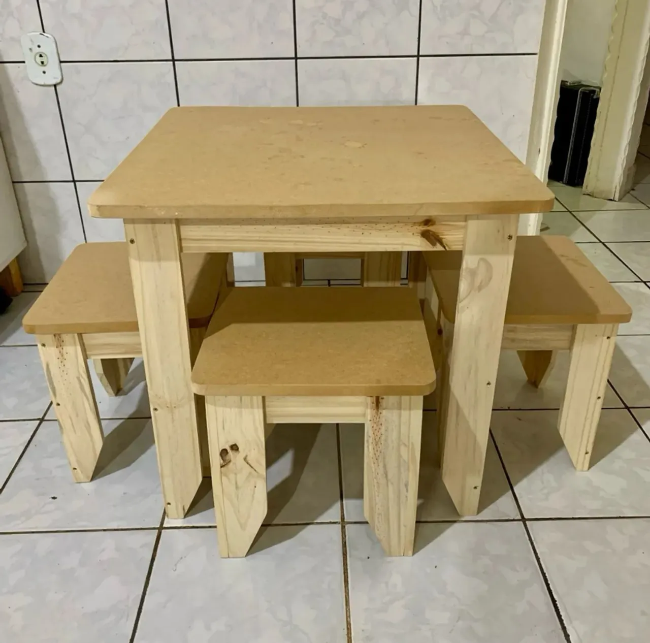 -Conjunto de mesa com 4 banquinhos infantil em madeira pinus.