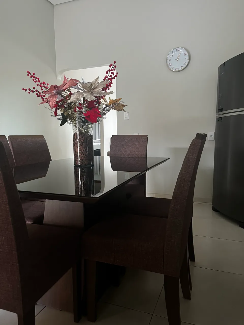 Linda mesa de jantar com design moderno e elegante. Perfeita para reunir a família e amigos em momentos especiais. Seu tampo de vidro e estrutura em madeira proporcionam sofisticação e durabilidade ao ambiente.
