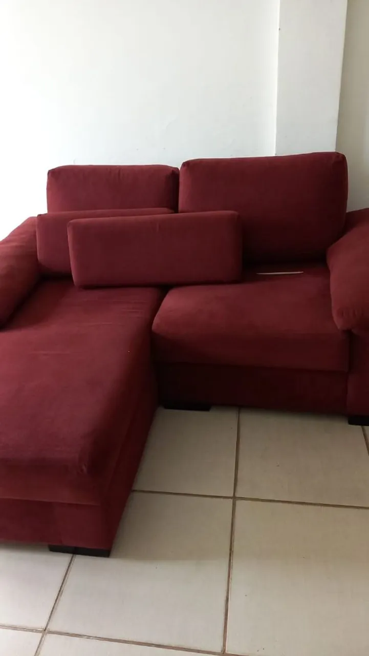 Sofá 2 lugares, com long chaise, cor de vinho. Mede 70 cm de altura, 75 cm de largura, 155 cm de comprimento.