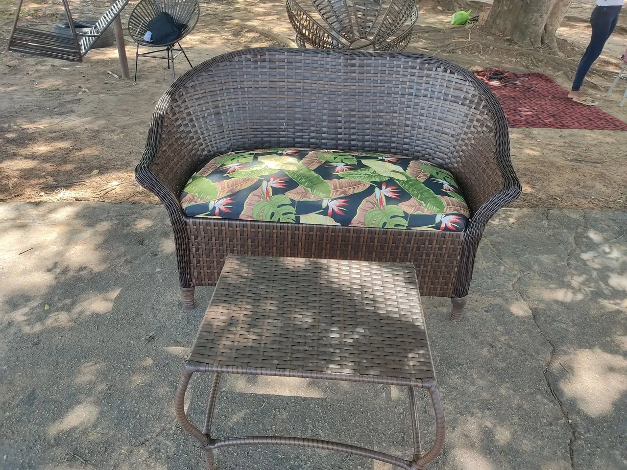 Sofá de fibra , com 2 lugares e almofadas confortáveis. Ideal para relaxar e receber amigos.