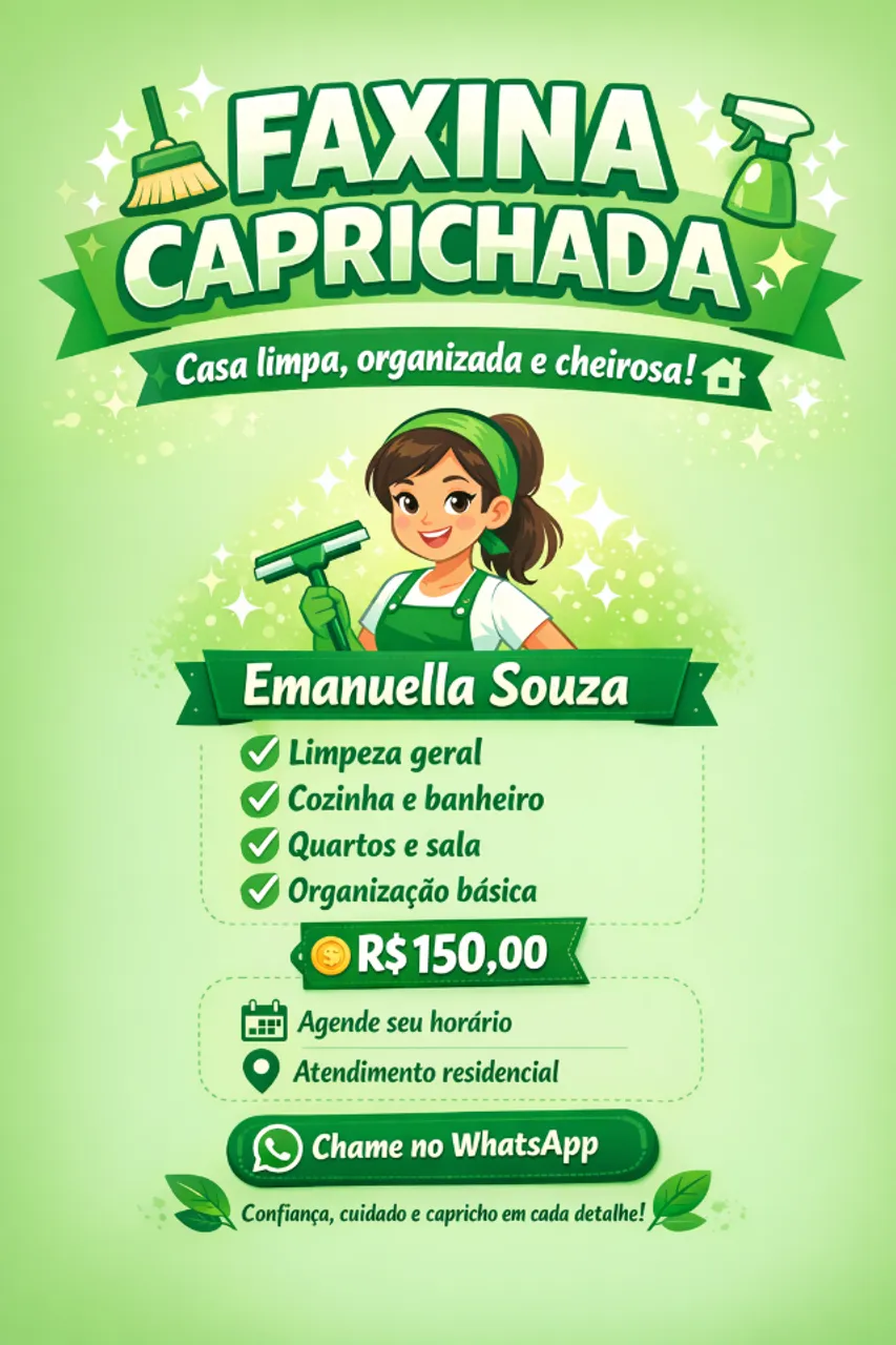 ? Tabela de Serviços de Faxina ? 4 horas: R$ 75,00 ? 6 horas: R$ 90,00 ? 8 horas: R$ 150,00 Atendimento com qualidade e confiança! ? Agende já sua faxina!